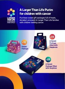 All proceeds from the Purim Mishloach Manot packages are dedicated to aid and support children with cancer and their families. Our partner Larger Than Life Israel is helping to provide families with the resources and care needed to continue their daily fight with cancer.